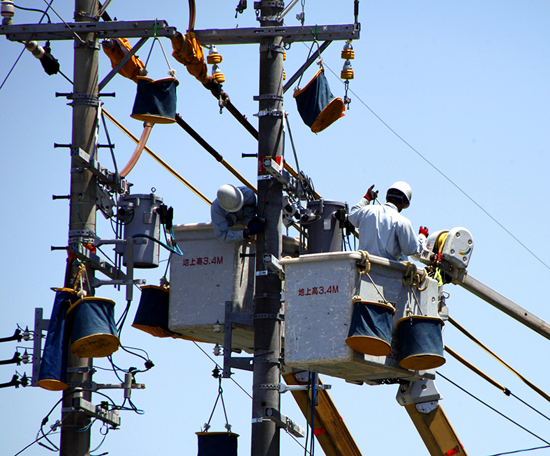 尾ヶ井電器の工事部では、屋内の内線電気工事、屋外の外線電気工事まで、多種多様な種類の工事を行っています。そのため、電気工事士や高所作業車運転資格等の資格を持った熟練したスタッフが作業を行っています。弊社は、建物の受変電設備から太陽光発電設備等、豊富な実績に培われた経験と技術力で、多種多様なニーズにお応えいたします。
